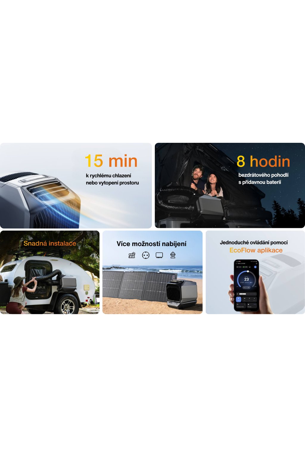 Chladicí výkon 6100 BTU, topný výkon 6800 BTU, bezdrátový provoz až 8 hodin, široké možnosti nabíjení a ovládání přes mobilní aplikaci. Ideální do auta, stanu, karavanu i obytného vozu.