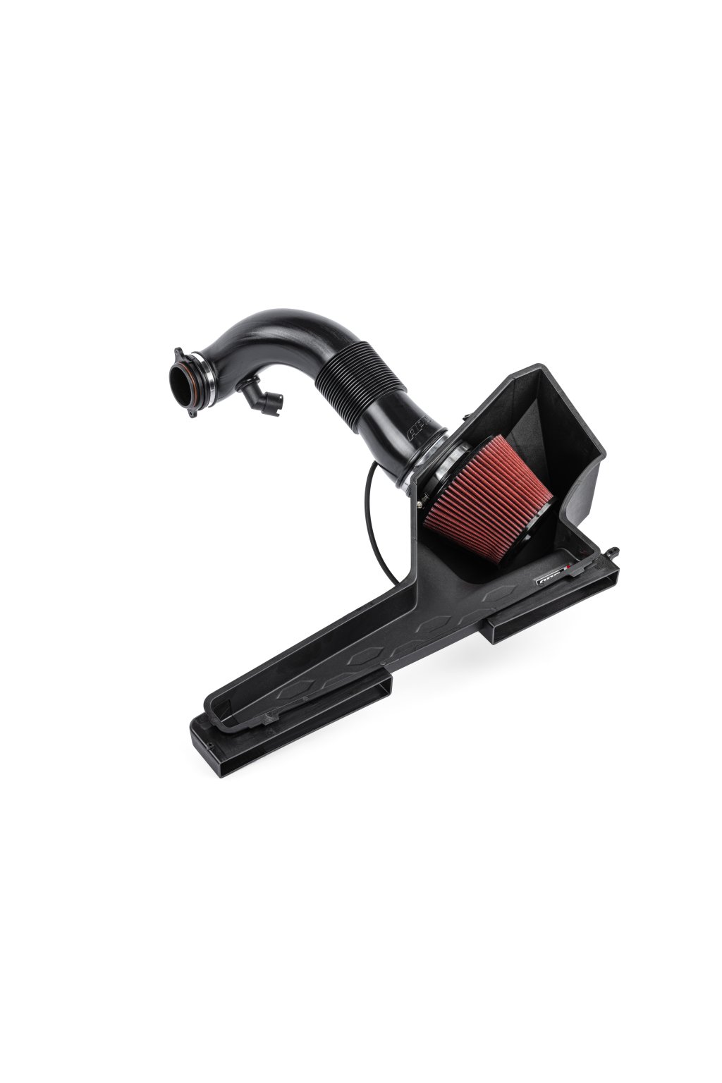The intake delivers significantly higher airflow than the stock system, reduces pressure drop, increases horsepower and torque, improves sound and engine-bay appearance, and can be tailored to the user’s configuration needs.