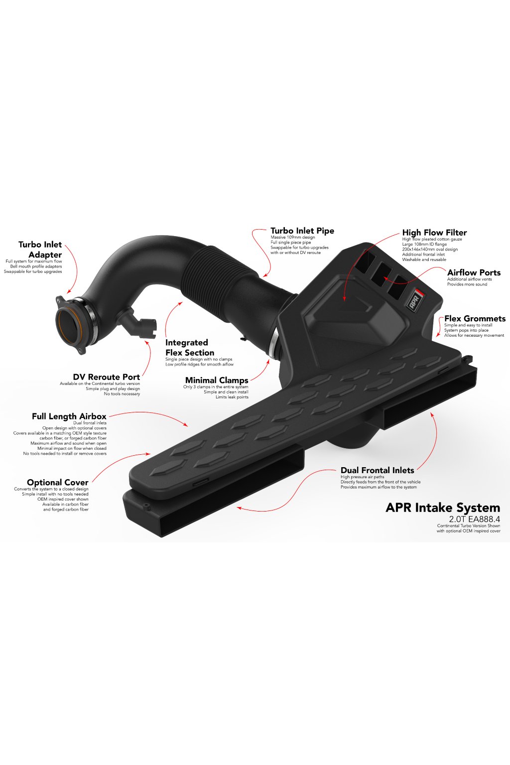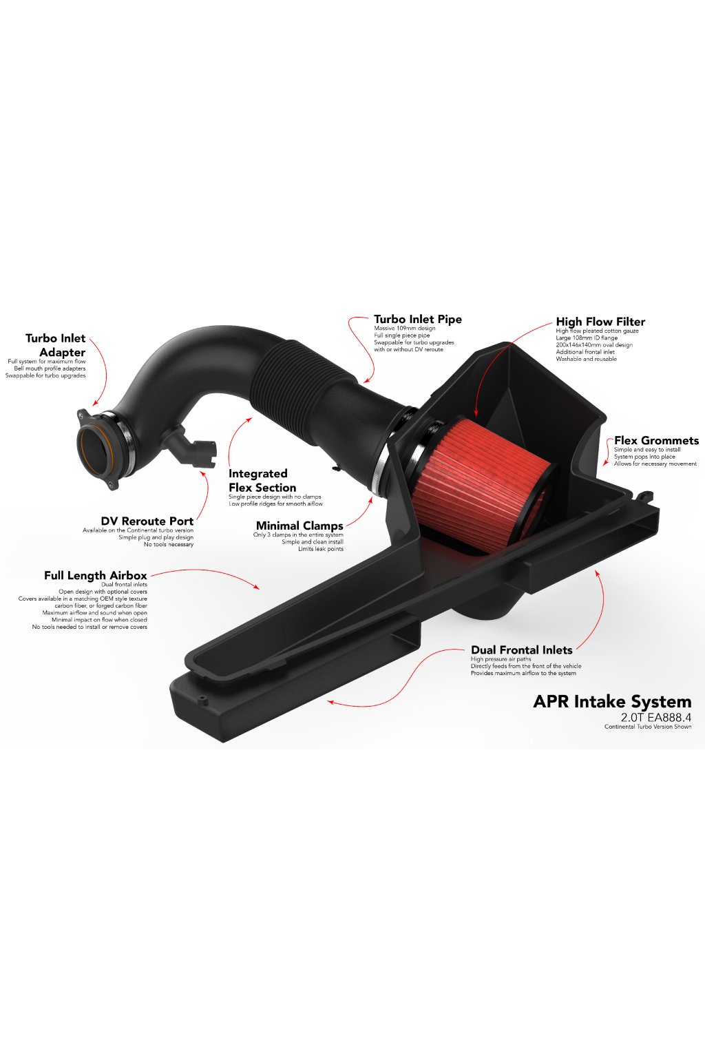 The APR Performance Intake for the 2.0 TSI EA888 EVO 4 engine improves power, airflow, and throttle response, is made from high-quality materials, easy to install, and can be configured as an open or closed system with optional covers.