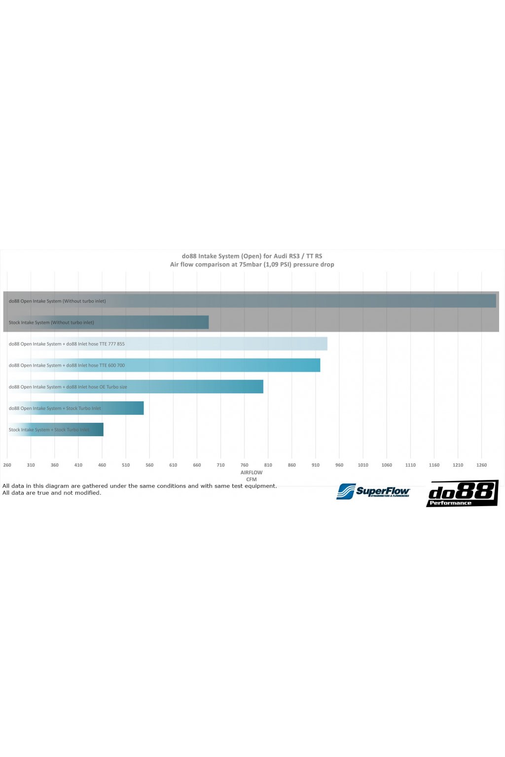 Jedná se pravděpodobně o největší sací systém pro TT RS a RS3 na trhu vyrobený z nejkvalitnějšího, vakuem impregnovaného, karbonu (twill 2x2 mm), které se připojuje vpředu pomocí obrovského nálevkovitého sacího žlabu, zajišťujícího dostatečný přívod vzduchu – bez ohledu na jeho požadavky. Obrovský 6" filtr BMC je umístěn v 8" uhlíkovém filtru připojeném k 6" potrubí, které se zužuje směrem k turbu, aniž by se kdy zužovalo na méně než 4,5" v nejužším úseku!