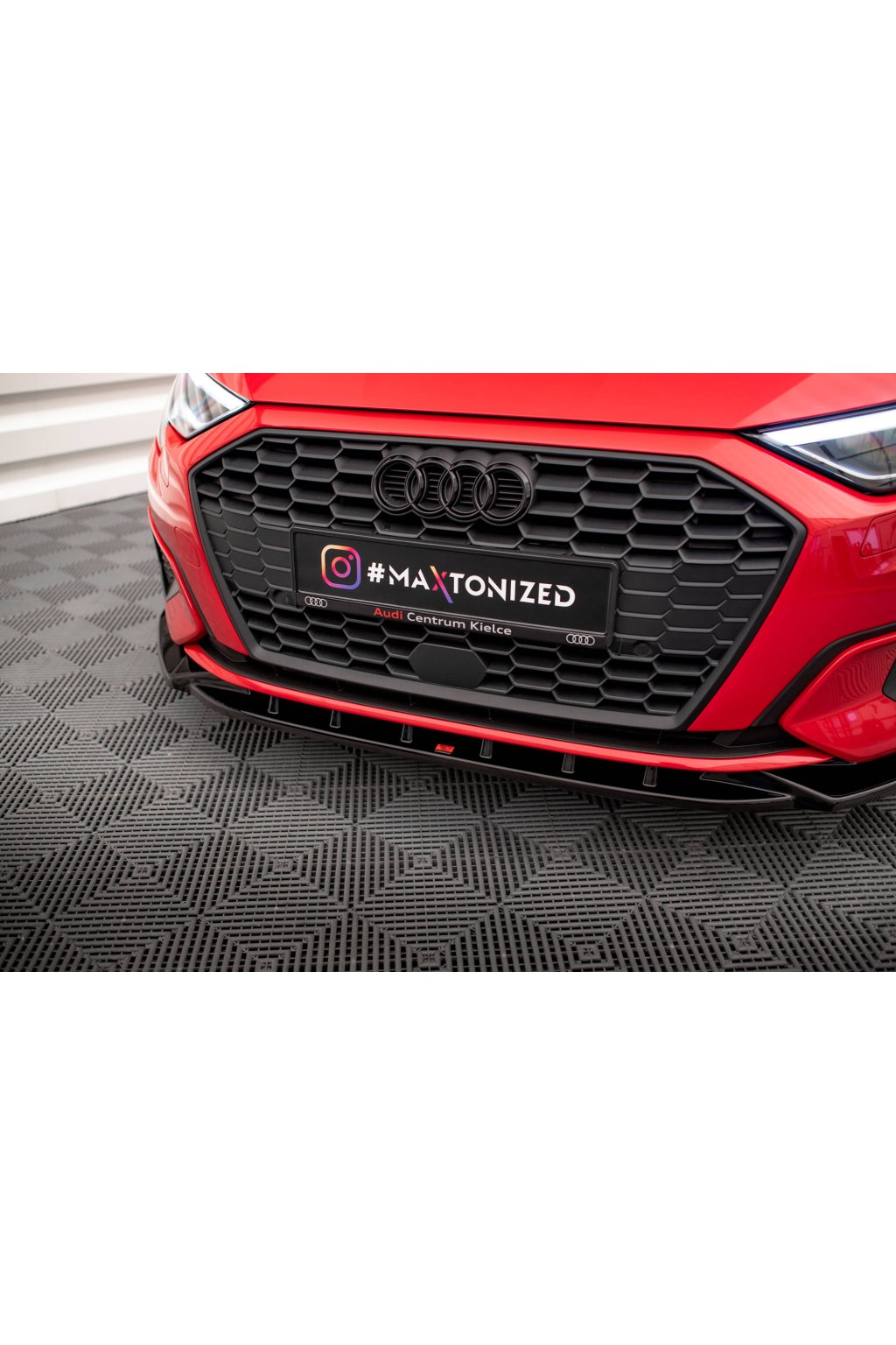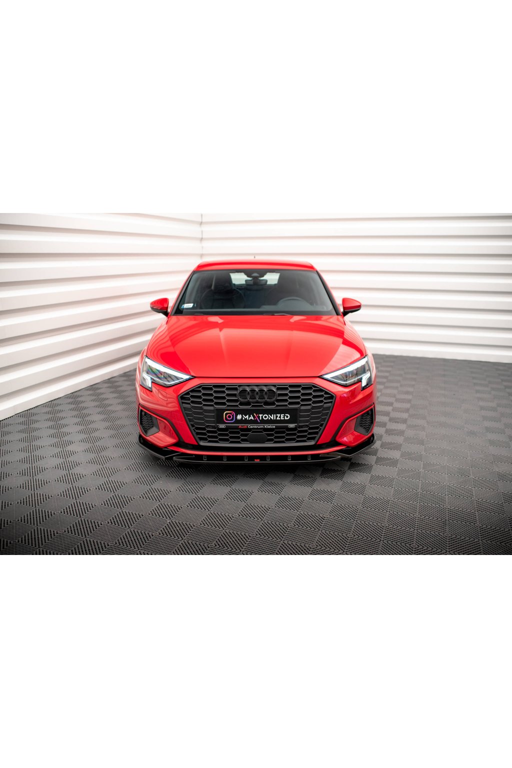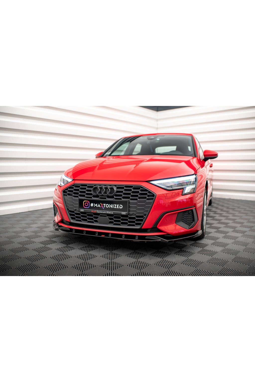 Maxton Design spoiler pod přední nárazník pro vozidlo Audi A3 8Y . Povrchová úprava spoileru černý lesklý plast ABS.