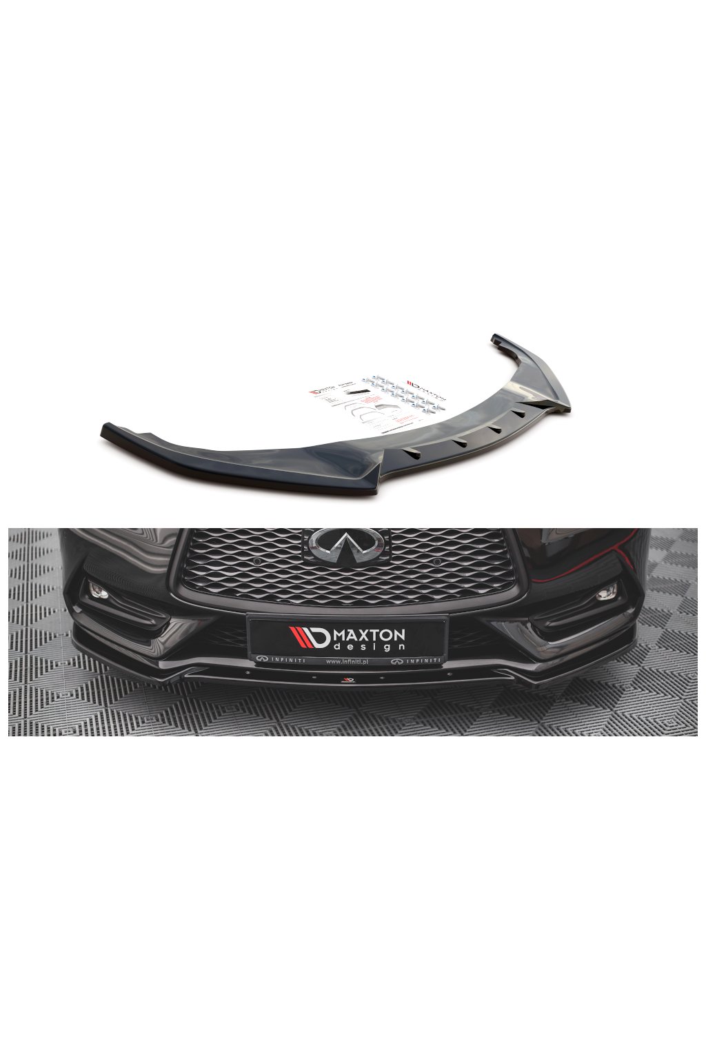 Maxton Design spoiler pod přední nárazník pro vozidlo Infiniti Q60 Mk2 . Povrchová úprava spoileru černý lesklý plast ABS.