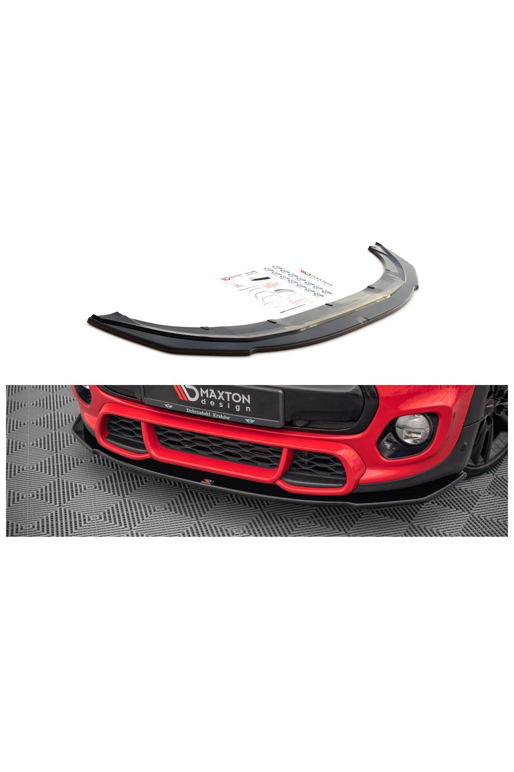 Maxton Design spoiler pod přední nárazník pro vozidlo Mini Cooper F56 JCW . Povrchová úprava spoileru černý lesklý plast ABS.