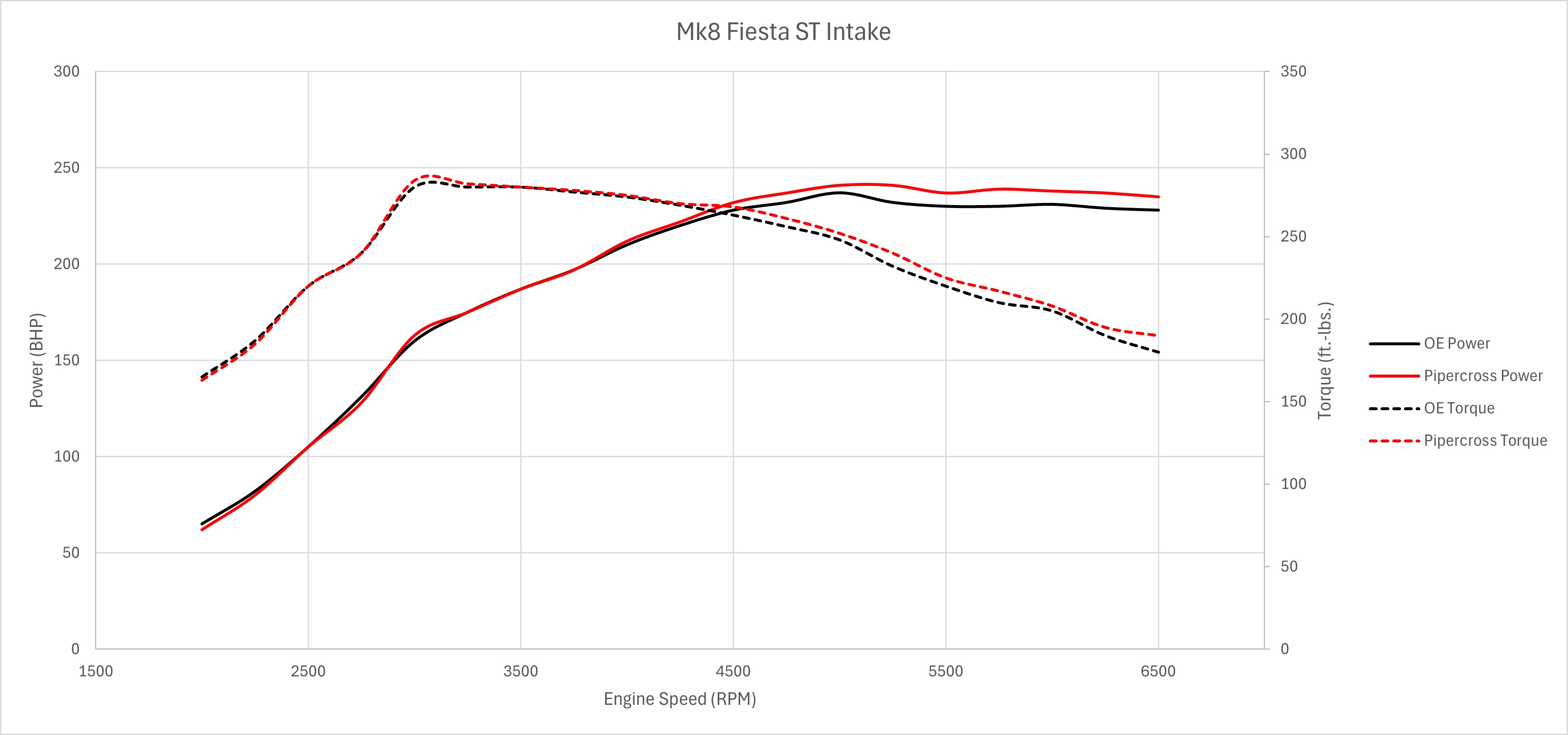 The data graphed shows the average of three runs for each configuration tested. As clearly visible, the Pipercross intake provides a substantial performance increase over the OE system, particularly at peak torque and at engine speed ranges greater than 4250 RPM. With increases of +9HP & +10ft-lbs TQ at peak, with consistant gains throughout the rev range, additionally (and not clearly demonstrated in the data graphed) is the consistency at which both the OE and Pipercross intakes performed. Each intake configuration posted data within ~5% for all three testing runs, indicating that both the OE and Pipercross intake configurations are markedly resistant to the adverse performance effects of continuously elevated engine bay temperatures (as well as affirming the performance benefits of the Pipercross parts over the OE system).