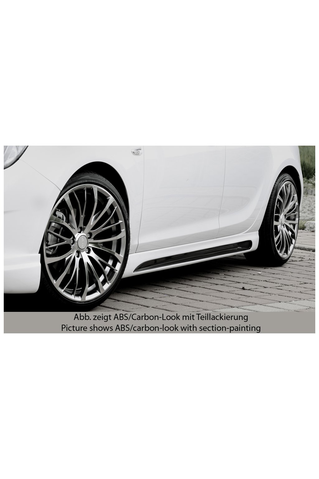Boční práh Rieger Tuning určen k montáži na vozy Opel Astra J 5-dvéř., hatchback, sedan/notchback, sports tourer vč. faceliftu r.v. 10/12-, 11/08-09/12. Je dodáván v provedení plast ABS s povrchovou úpravou Carbon-Look, určeno k lakování.