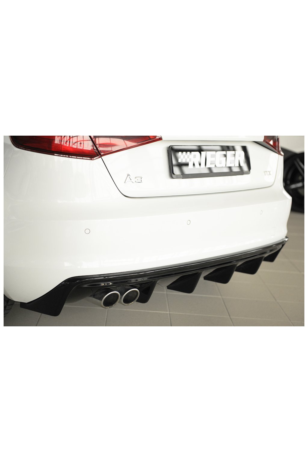 Rieger Tuning vložka zadního nárazníku (GBL56786) pro vozy Audi A3 8V 3-dvéř. (hatchback 8V1), 5-dvéř. (sportback 8VA) před faceliftem, 07/12-08/16. Provedení v černém lesklém laku bez nutnosti dalšího lakování.