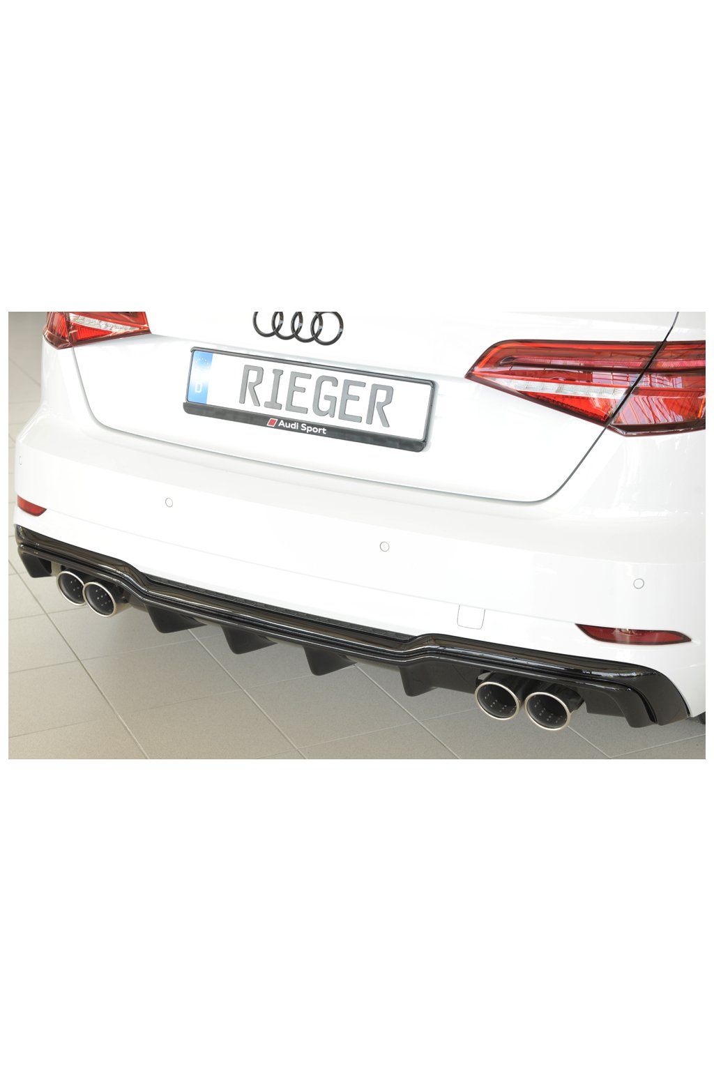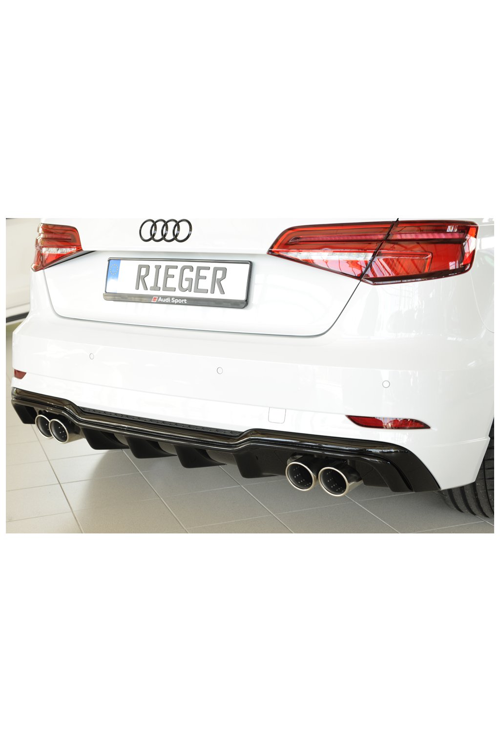 Rieger Tuning vložka zadního nárazníku pro vozy Audi A3 8V 3-dvéř. (hatchback 8V1), 5-dvéř. (sportback 8VA) po faceliftu, 09/16-. Provedení v černém lesklém laku bez nutnosti dalšího lakování.