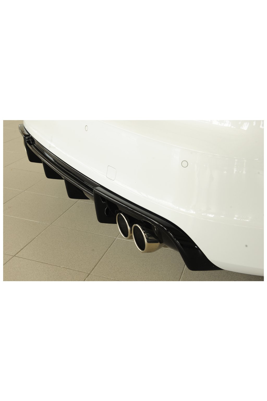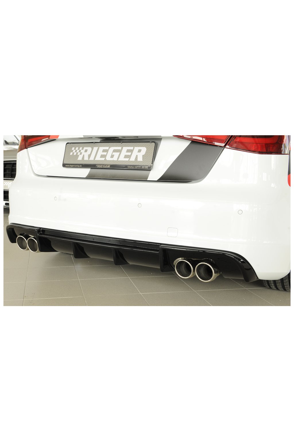 Rieger Tuning vložka zadního nárazníku pro vozy Audi A3 8V 3-dvéř. (hatchback 8V1), 5-dvéř. (sportback 8VA) před faceliftem, 07/12-08/16. Provedení v černém lesklém laku bez nutnosti dalšího lakování.
