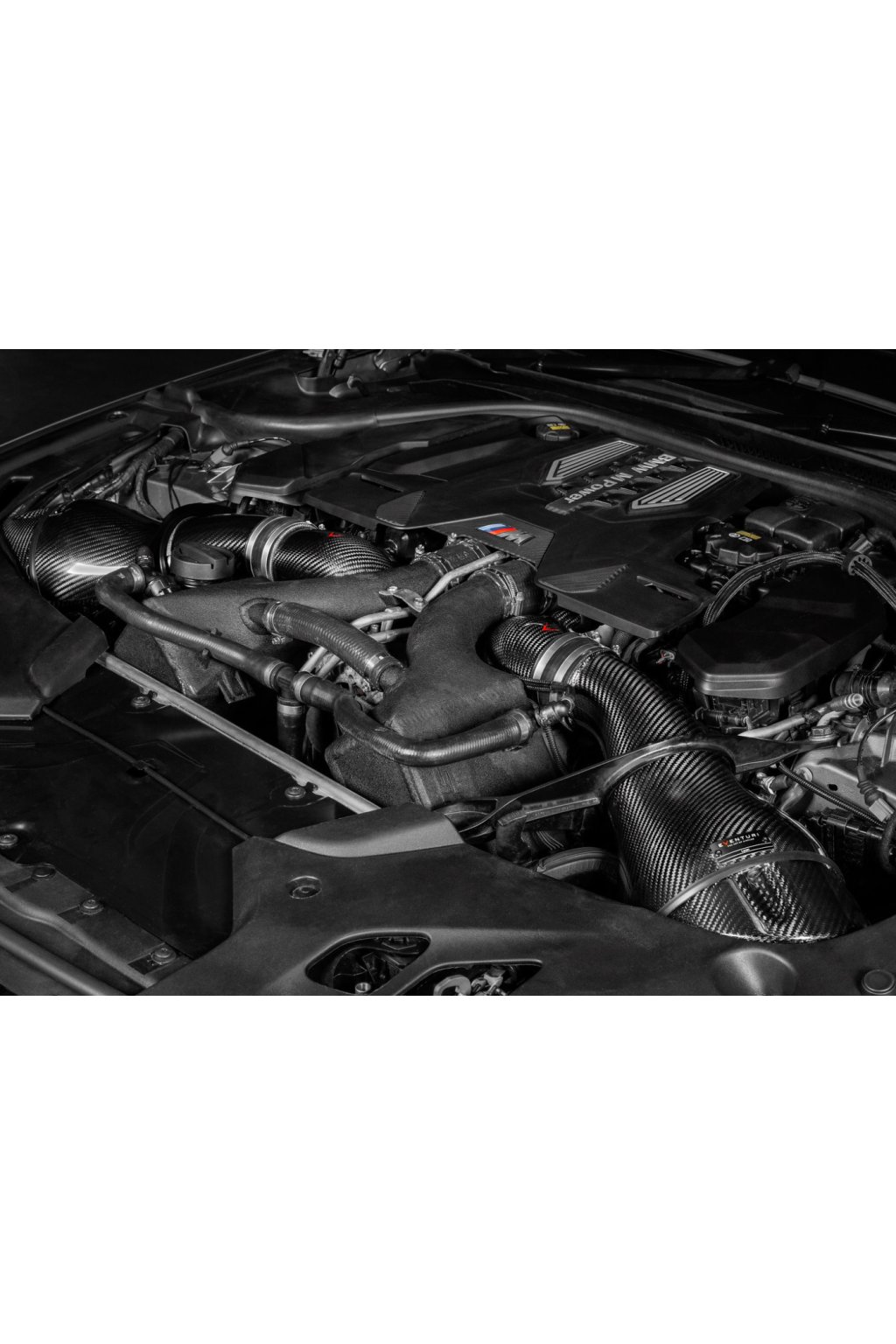 Nerestriktivní a tepelně izolované karbonové vstupy do turbodmychadel (turbo inlety) Eventuri pro vozy BMW M5 F90. Hlavními přínosy tohoto vedení jsou zvětšený průměr, zlepšené proudění i kapacita vzduchu a zabránění pronikání tepla do sání před turbodmychadly.