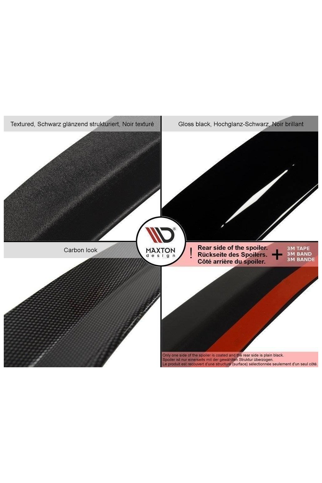 Vybraná povrchová úprava je výrobcem použita pouze na vrchní straně spoileru. Spodní strana (i v případě, že je viditelná) je vždy v surovém plastu bez povrchové úpravy.