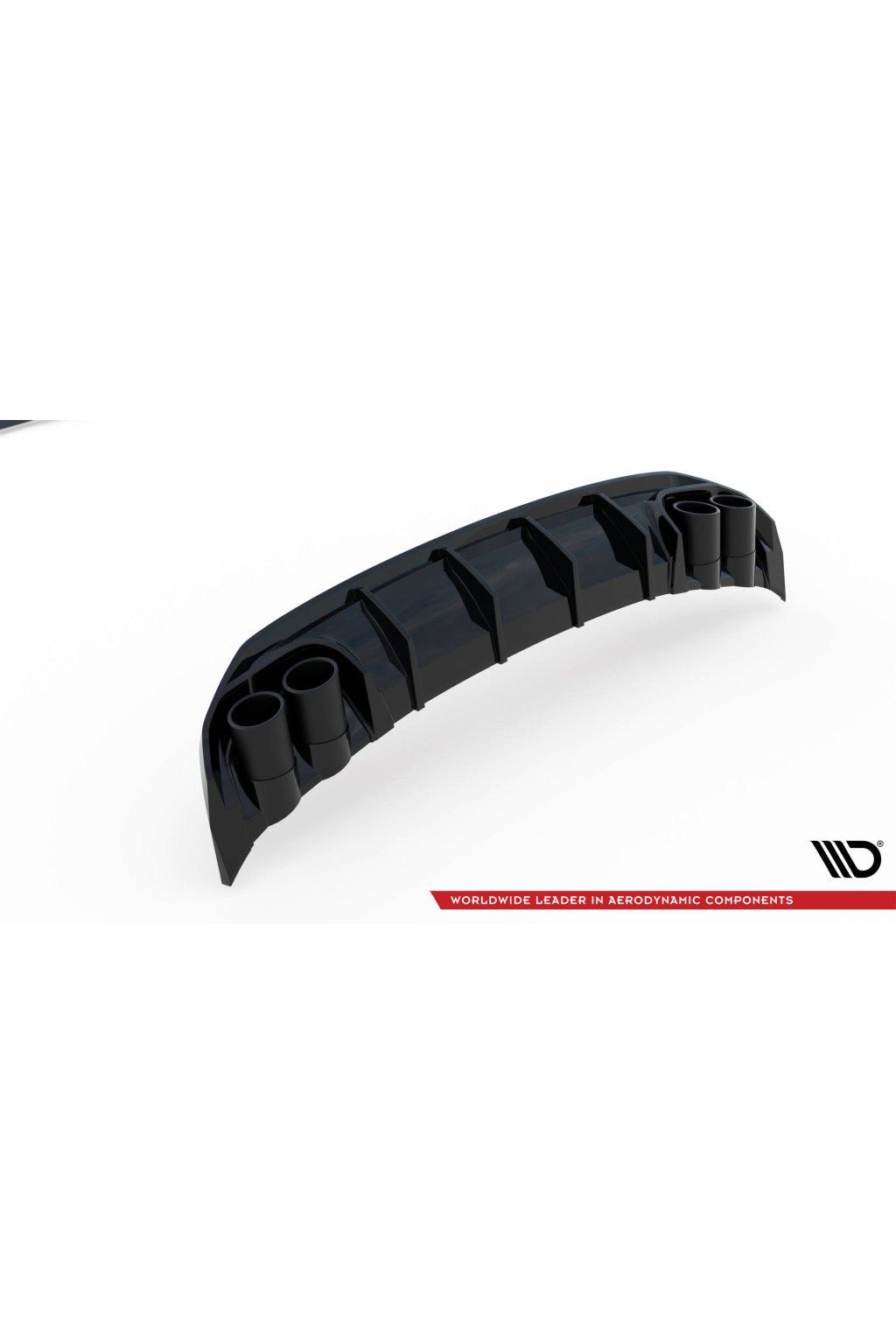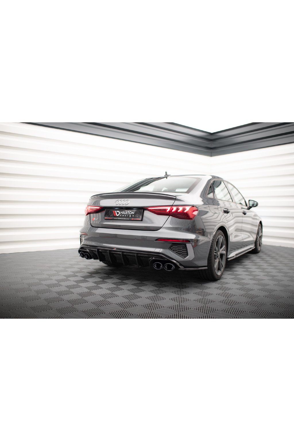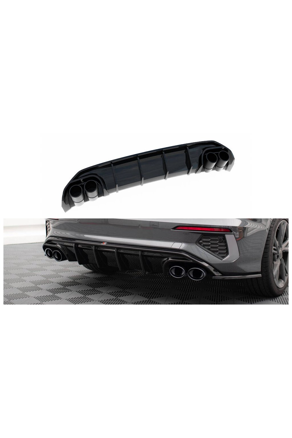 Maxton Design vložka zadního nárazníku s černými imitacemi koncovek výfuku pro vozidlo Audi A3 8Y . Povrchová úprava spoileru černý lesklý plast ABS.