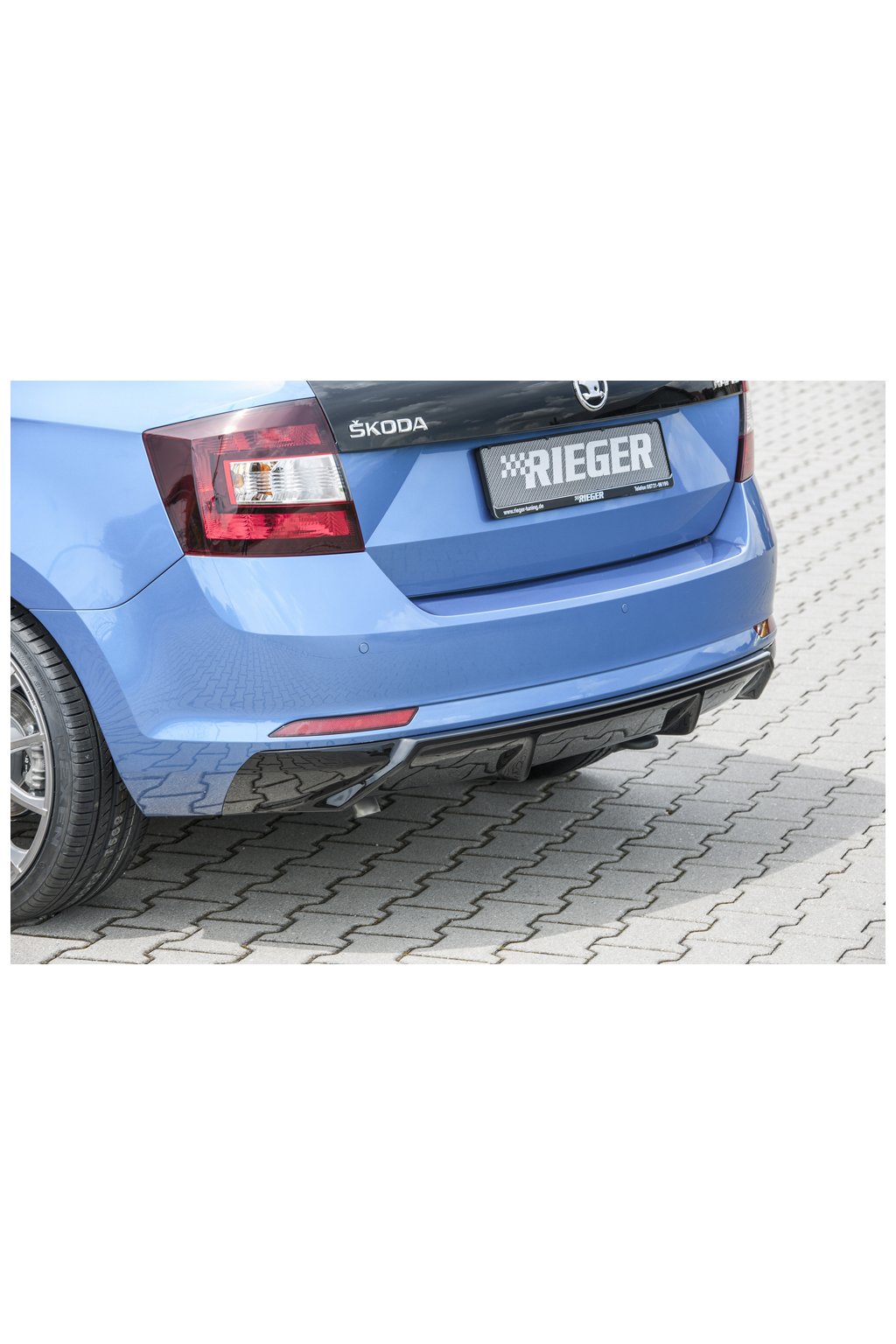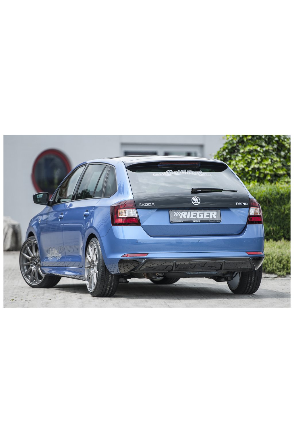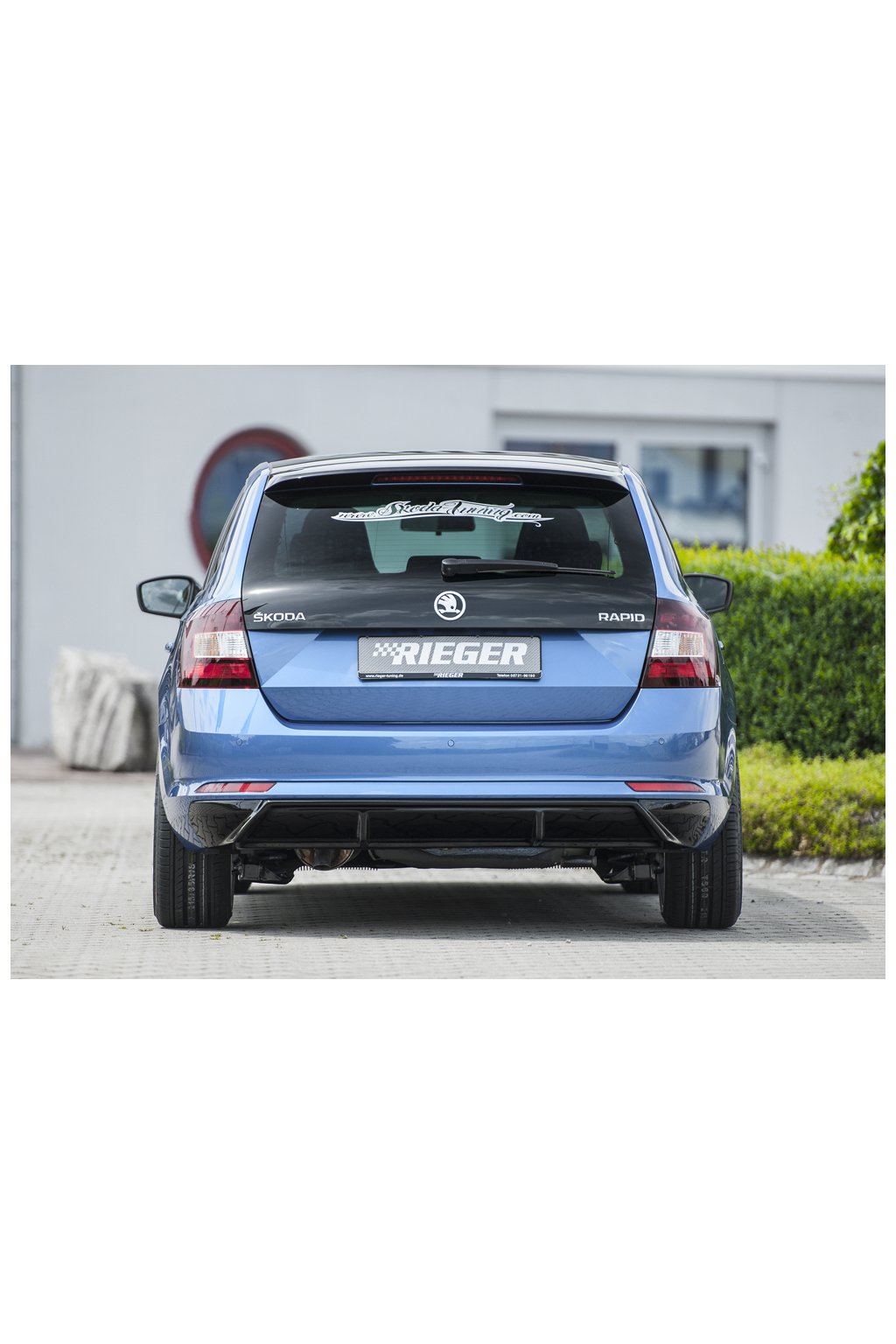 Rieger Tuning vložka zadního nárazníku pro vozy Škoda Rapid NH spaceback vč. faceliftu, 05/17-, 07/12-04/17. Provedení v černém lesklém laku bez nutnosti dalšího lakování.