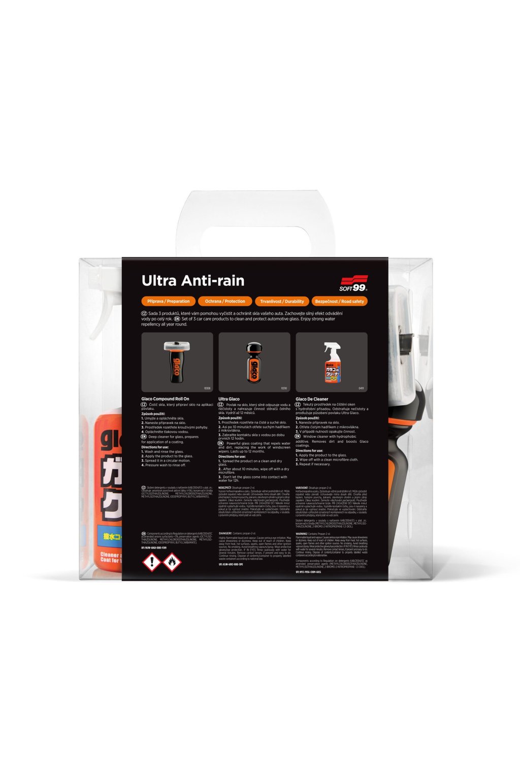 Sada oblíbených výrobků Soft99, díky které snadno vyčistíte a ochráníte okna svého vozu. Díky nejprodávanějším tekutým stěračům Ultra Glaco zajistíte účinek trvající po celý 1 rok. Vysoce hydrofobní povlak zajišťuje rychlý odvod vody, zlepšuje viditelnost při jízdě v dešti a zajišťuje bezpečnost a pohodlí na cestách.