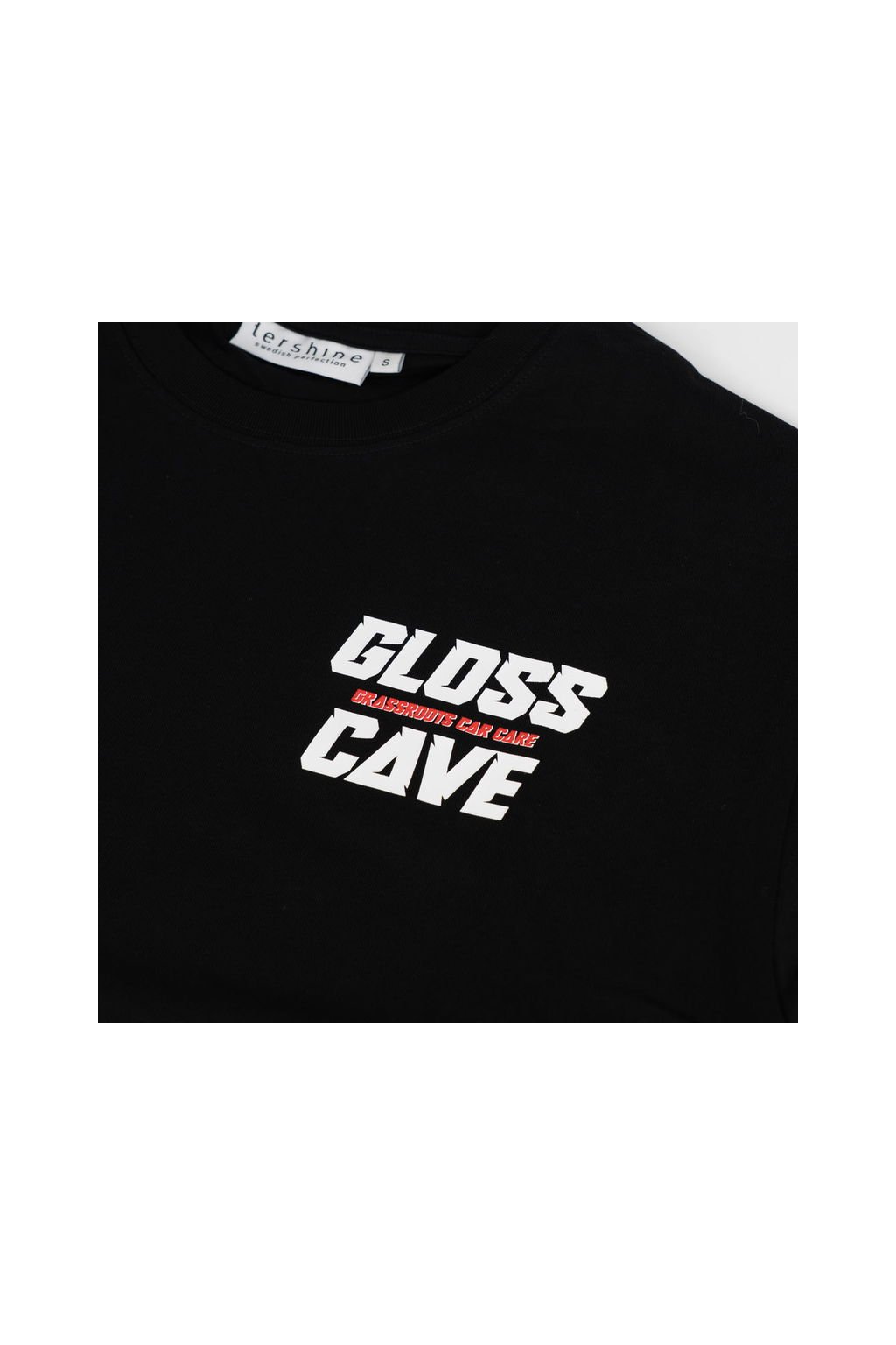 Na hrudi najdeš malý textový detail, záda pak patří ikonickému vozu skupiny B – Ford RS200, doplněnému textem o Gloss Cave. Celek uzavírá tkaná etiketa na pravém rukávu, která podtrhuje důraz na detail.