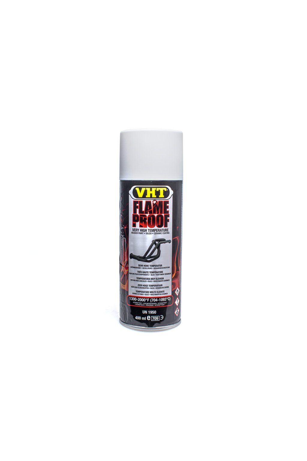 VHT Flameproof™ žáruvzdorná matná bílá barva obnovuje a prodlužuje životnost povrchům vystavovaným extrémním teplotám (až 1093°C). V automobilovém průmyslu se nejčastěji využívá pro lakování svodů a dalších výfukových částí či bloků a hlav motoru.